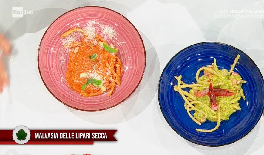 busiate ai due pesti di Fabio PotenzanoBello, bravo e siciliano, lo chef Fabio Potenzano prepara una delle sue specialità, che raccontano una terra ed una gastronomia straordinarie. Oggi, nel dettaglio, due primi piatti, con due condimenti diversi. Ecco le busiate ai due pesti.