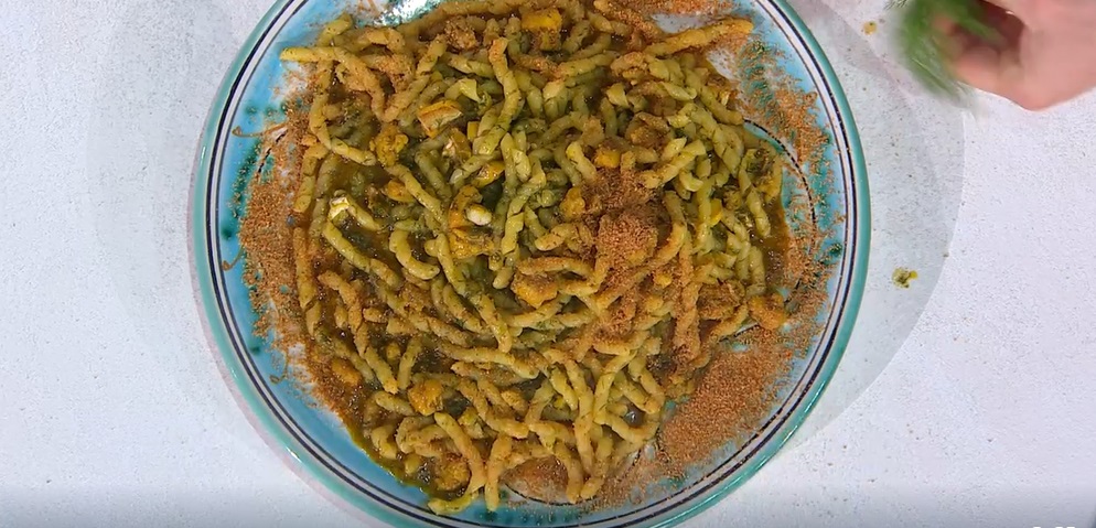 Cuociamo le busiate nell’acqua di cottura del finocchietto, le scoliamo e le saltiamo con il condimento. Serviamo con sopra la mollica tostata.