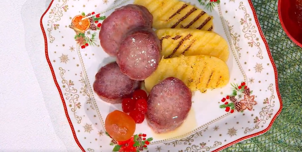 Per accompagnare, prepariamo delle fette di polenta grigliata e della mostarda.
