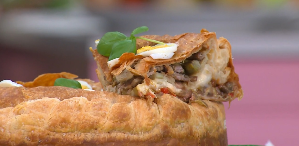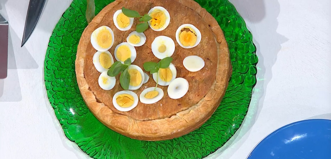 Continuiamo mettendo sopra la carne tagliata a listarelle, i carciofi e la pancetta fatti in padella. Un altro rotolo di sfoglia, attorcigliamo bene i bordi. Spennelliamo con olio, mettiamo un pizzico di sale e inforniamo a 160° per 1 ora e poi a 180° per altri 20 minuti. Decoriamo con uova sode tagliate a fettine e qualche foglia di basilico.