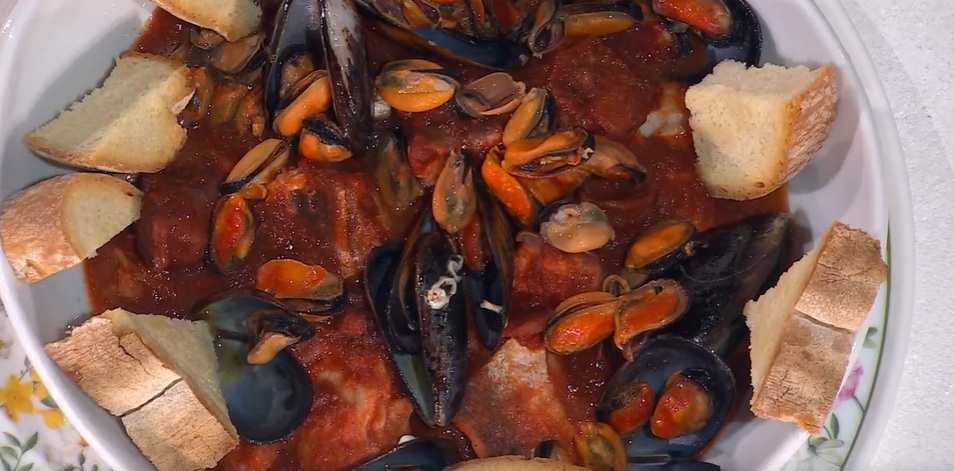 Copriamo tutto con il brodo di pesce, copriamo col coperchio e facciamo cuocere un’oretta. Serviamo, in un tegame di coccio, appoggiando sopra le cozze cotte e sgusciate. Completiamo con fette di pane tostato in forno, strofinato con aglio.