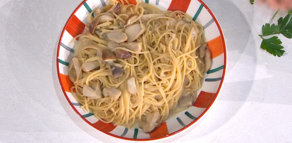 - 320 g spaghetti, 160 g funghi porcini, 1 spicchio d’aglio, 1 rametto di rosmarino, 50 ml olio evo, 120 g pecorino grattugiato, pepe
