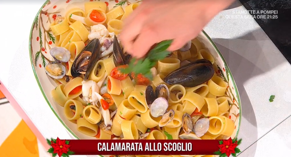 - 400 g calamarata, 200 g cozze, 200 g vongole, 1 seppia, 5 scampi, 250 g pomodorini datterini, 3 spicchi d’aglio, 1 bicchiere vino bianco, prezzemolo, basilico, olio evo, sale e pepe