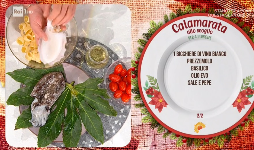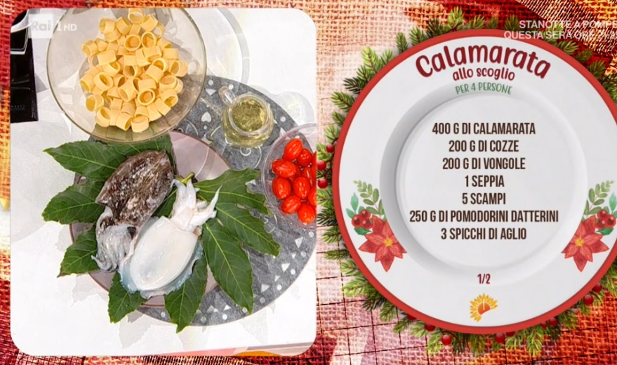 calamarata allo scoglioPuntata breve e velocissima, che vede sfilare in cucina anche Mauro e Mattia Improta, padre, figlio e cuochi napoletani. I due preparano un primo piatto della Vigilia, una pasta. Ecco la calamarata allo scoglio.