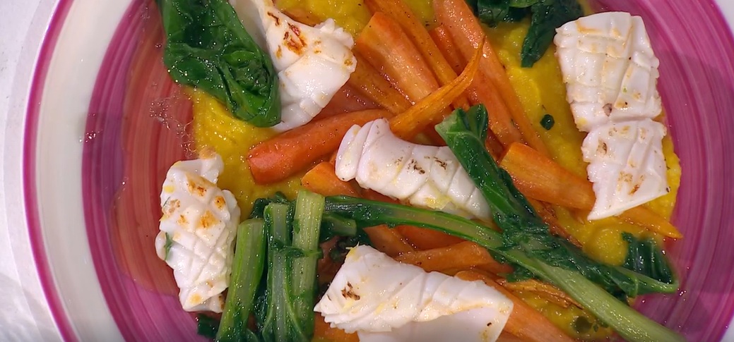 Su un letto di crema di patate, disponiamo i calamari, le carote, la bieta.