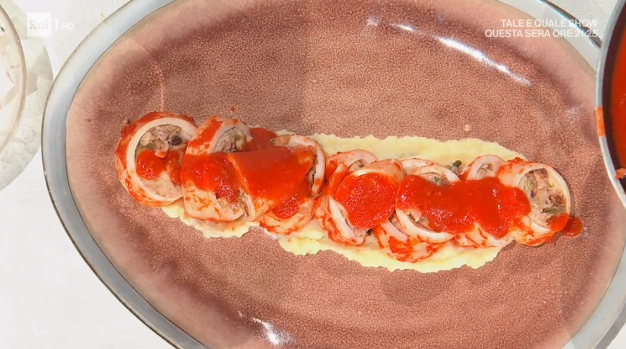 Serviamo i calamari su un letto di salsa di patate e, a piacere, con il sugo di pomodoro.