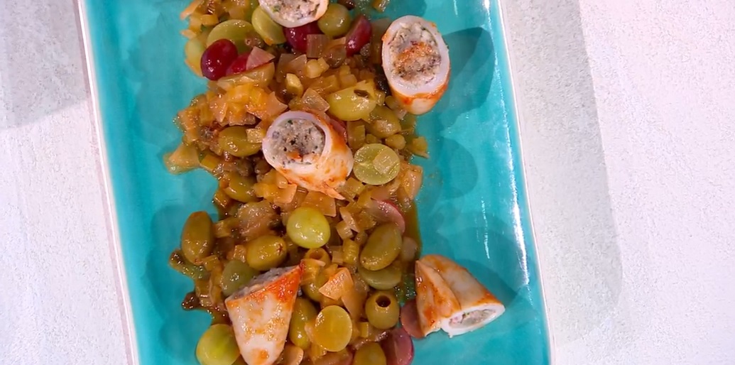 In questa giornata uggiosa, perlomeno nel nord Italia, Fabio Potenzano ci regala un po’ del sole della sua bellissima Sicilia. Il cuoco bagherese propone un piatto del cuore, ovvero un calamaro ripieno e caponata d’uva.