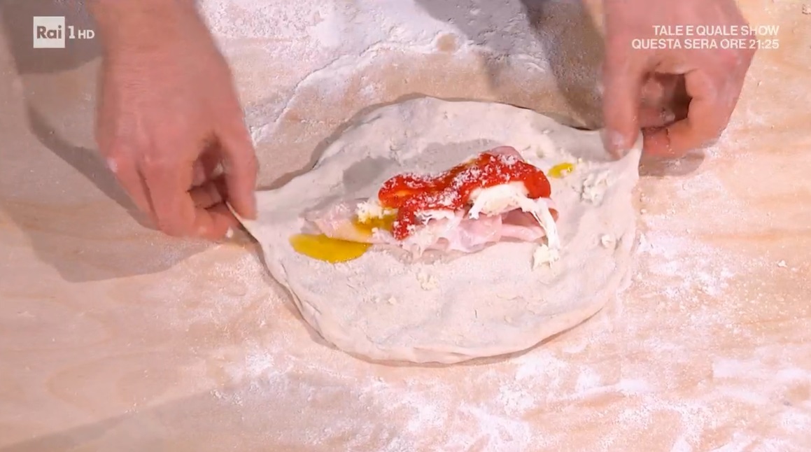Prendiamo un panetto e lo stendiamo sul piano infarinato, con le mani, fino ad ottenere un disco sottile, anche sui bordi. Su una metà o al centro dei disco mettiamo una fetta di prosciutto cotto, un po’ di mozzarella, un cucchiaino di passata di pomodoro, parmigiano grattugiato ed un filo d’olio. Ripieghiamo l’impasto sul ripieno, a formare una mezzaluna. Sigilliamo bene i bordi, schiacciando con le dita. Disponiamo i panzerotti sulla teglia e li sporchiamo in superficie con un po’ di passata di pomodoro. Cuociamo in forno caldo e statico a 250° per 12-16 minuti.
