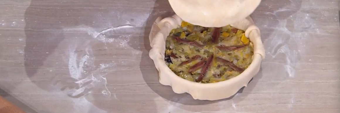 Con il mattarello, stendiamo il panetto più grande ad uno spessore di mezzo cm. Usiamo il disco ottenuto per foderare una tortiera ben unta d’olio, fondo e bordi. Distribuiamo all’interno gli sponsali saltati e disponiamo sopra le acciughe rimaste. Copriamo con il secondo disco di pasta, quindi sigilliamo i bordi con una forchetta. Spennelliamo la superficie con l’olio e cuociamo in forno caldo e statico a 250° per 20 minuti.