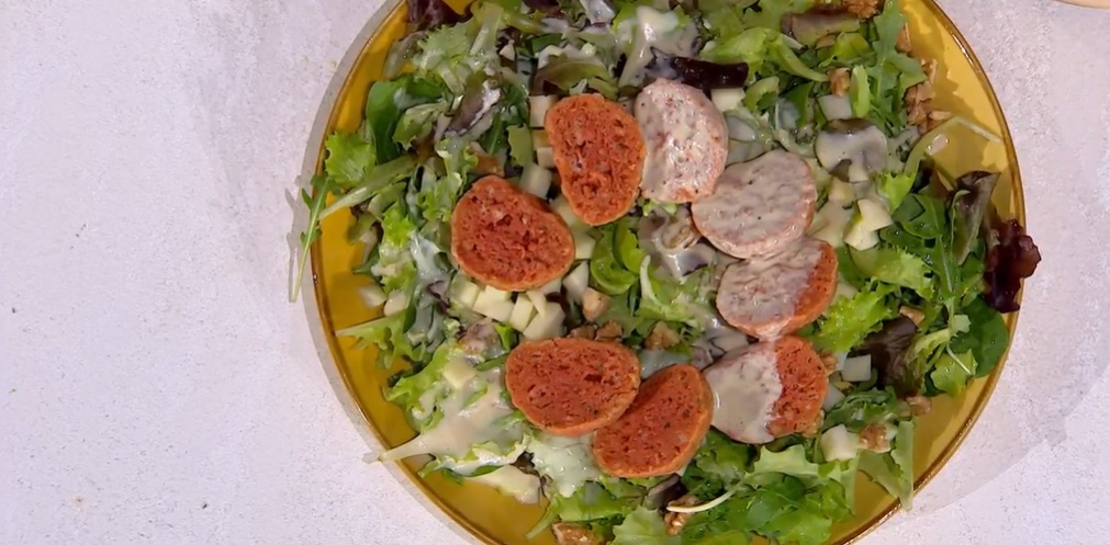 Sul piatto da portata, formiamo un letto di insalatina con la misticanza, la mela a dadini e le noci sbriciolate. Disponiamo sopra i canederli a fette e coliamo sopra la salsa di yogurt.