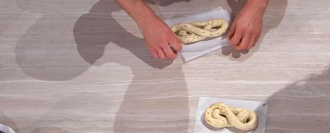 Allunghiamo ciascun filone fino a 50-60 cm. Intrecciamo ciascun filoncino suu se stesso, dando la forma di un 8 (foto). Posizioniamo ciascun tarallo su un quadrato di carta forno, quindi su una teglia. Copriamo e lasciamo lievitare per 2 ore. Pratichiamo delle piccole incisioni in diversi punti, quindi li immergiamo in acqua bollente e lasciamo immersi per 1-2 minuti. Li scoliamo sulla teglia con carta forno e cuociamo in forno caldo a 220° per 12 minuti.