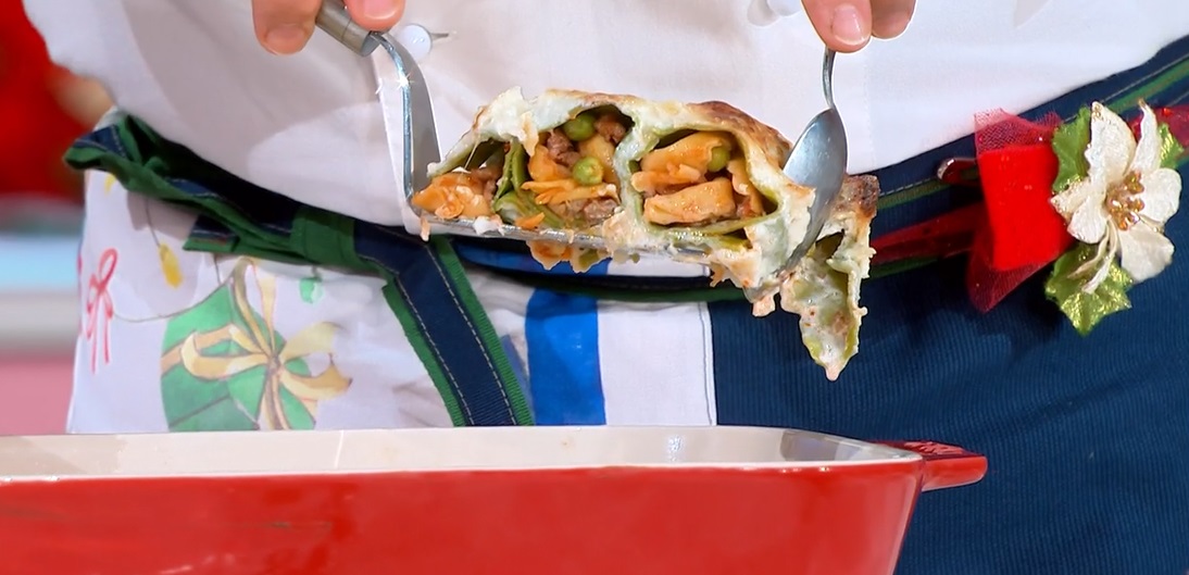 Sbollentiamo le sfoglie delle lasagne (verdi e gialle). Condiamo i tortellini già cotti con il ragù raffreddato.