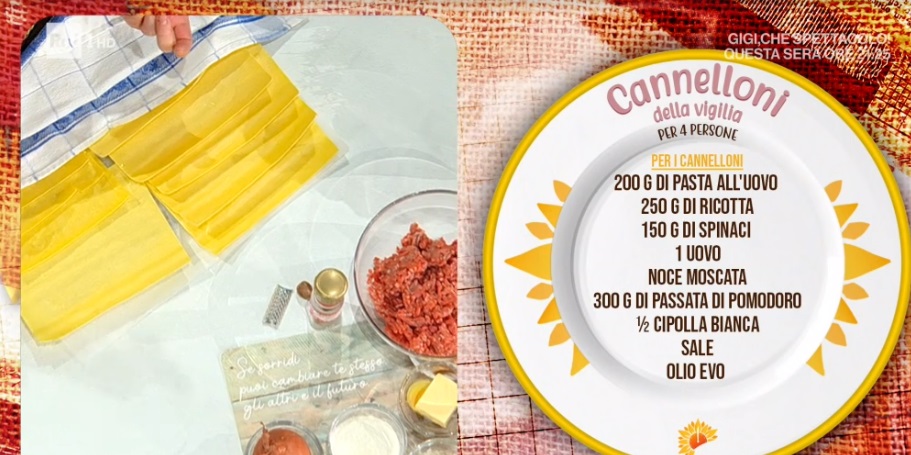 - 200 g pasta all’uovo, 250 g ricotta, 150 g spinaci, 1 uovo, noce moscata, 300 g passata di pomodoro, mezzo cipolla, sale, olio