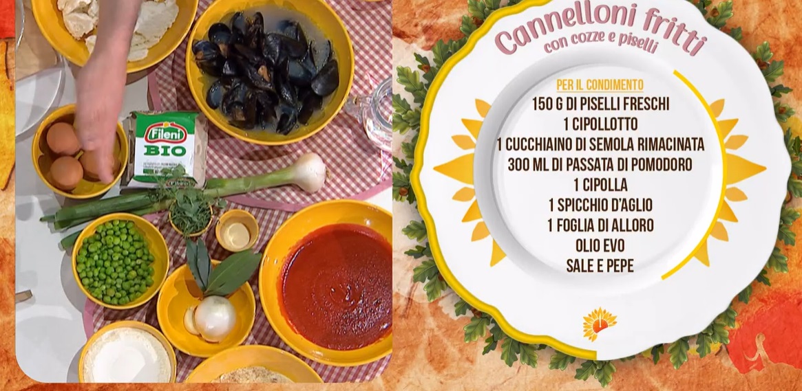 Per la farcia, in una ciotola mettiamo la ricotta, le cozze aperte e sminuzzate al coltello, un pochino di acqua delle cozze e della semola. Amalgamiamo tutto, trasferiamo in un sacco a poche e farciamo i rettangoli di sfoglia. Li arrotoliamo ottenendo i cannelloni, che mettiamo in freezer per qualche ora a rassodare. Poi li paniamo, passandoli prima nella farina, poi nelle uova sbattute e infine nel pangrattato. Li friggiamo in olio bolente e profondo. Poi li scoliamo, asciughiamo e tagliamo a pezzetti.