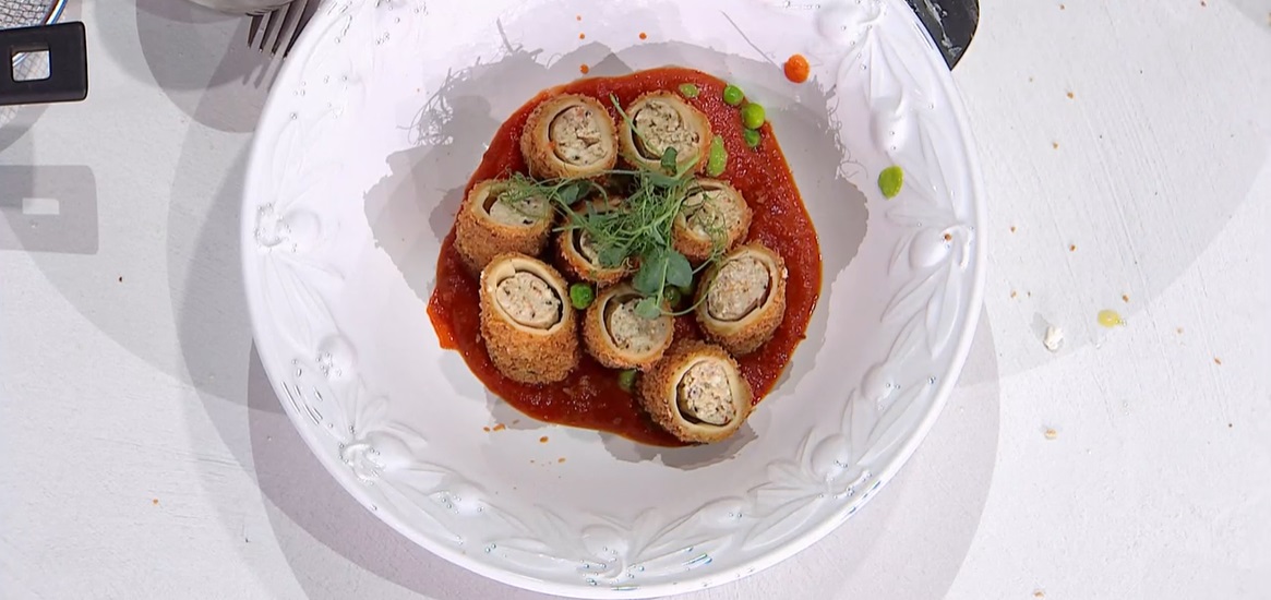 Serviamo i cannelloni fritti su un letto di classica salsa di pomodoro scaldata in padella e con sopra qualche cucchiaita di salsa ottenuta frullando i piselli sbollentati con un goccio di acqua,di olio e un pizzico di sale. Ultimiamo con qualche cozza intera.