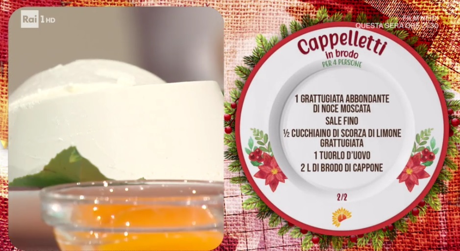 - 300 g ricotta di pecora asciutta, 150 g squacquerone, 150 g caciotta di mucca, 100 g formaggio grattugiato, 1 grattugiata di noce moscata, mezzo cucchiaino di scorza di limone grattugiata, 1 tuorlo d’uovo, 2 l brodo di cappone