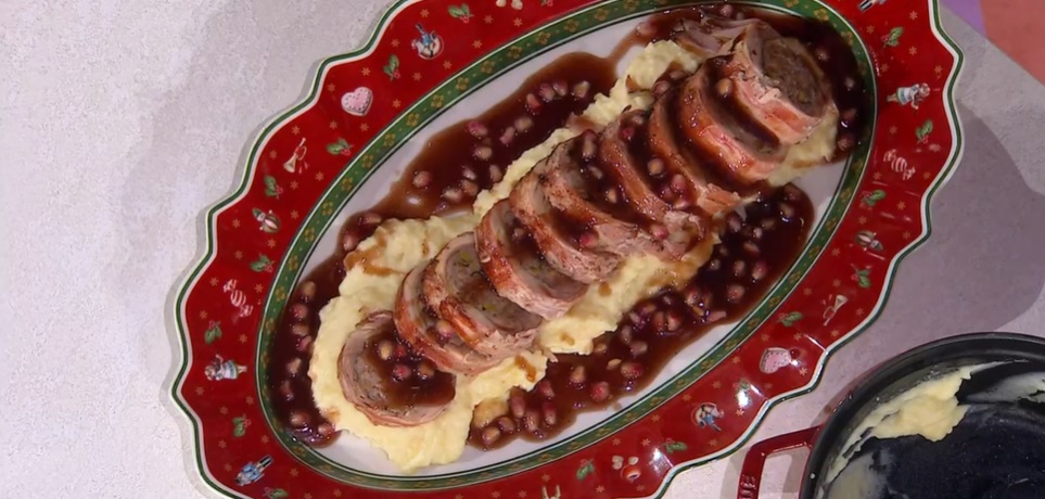 Questa difficile puntata, segnata dal lutto per la giovane Giulia, prosegue con la ricetta di Fabio Potenzano. Il cuoco siciliano, oggi, propone un secondo piatto delle feste, il cappone ripieno con salsa alla melagrana.