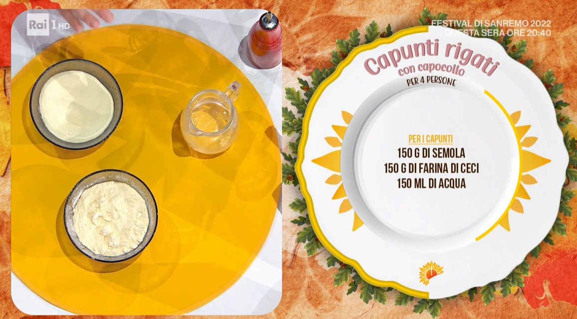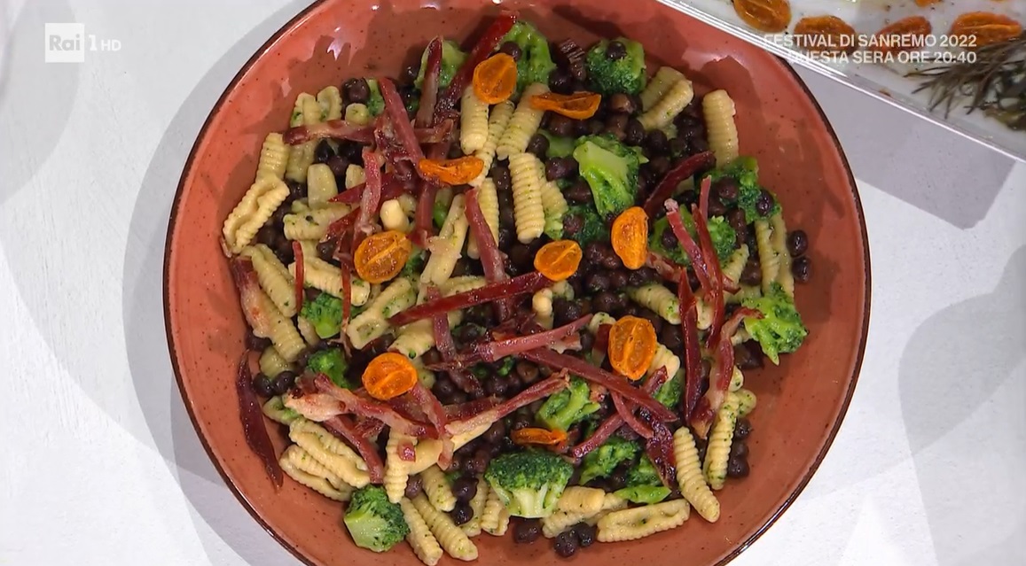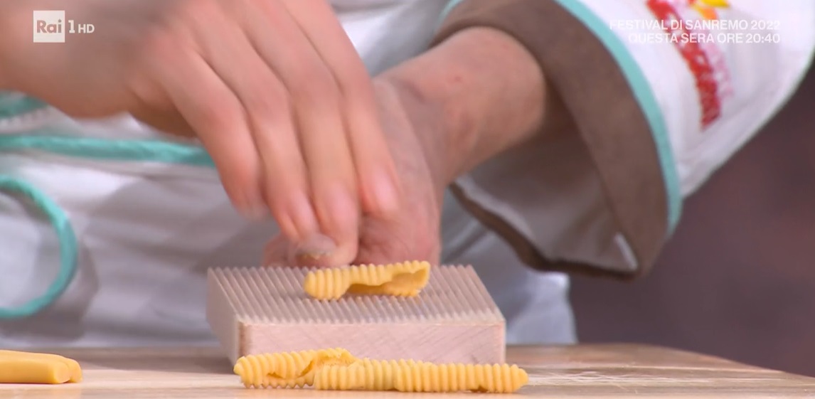 capunti rigati con capocollo di Antonella RicciDopo un appassionato collegamento di Federico Quaranta dalla Puglia, arriva in studio Antonella Ricci, fiera rappresentante della cucina pugliese. La chef salentina propone un piatto che esalta il capocollo pugliese, un salume dall’antica tradizione. Ecco i capunti rigati con capocollo.