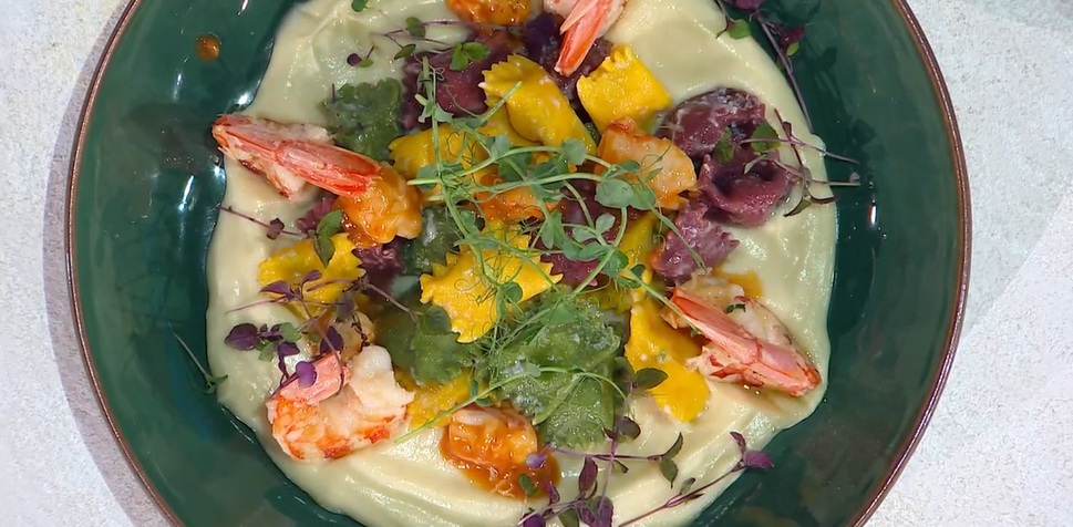 Scoliamo i raviolini e li mettiamo in una ciotola con una noce di burro. Mescoliamo e li serviamo su un letto di crema di sedano rapa, con sopra i gamberi con la bisque e quelli scottati in padella, al naturale.