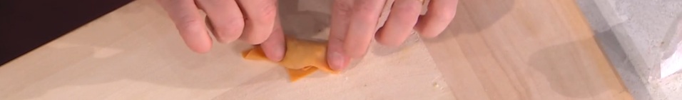 Facciamo la sfoglia impastando la farina con le uova e il concentrato di pomodoro. Lasciamo riposare il panetto avvolto nella pellicola trasparente, quindi lo tiriamo col mattarello in una sfoglia non troppo sottile. Ritagliamo dei quadrati.