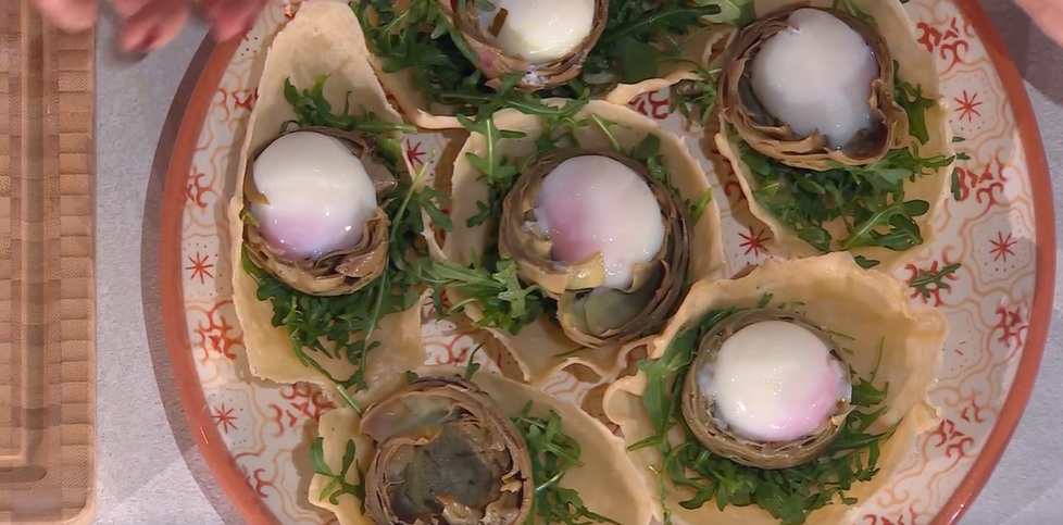 Serviamo le uova all’interno dei carciofi, con dei cestini di parmigiano e della rucola.