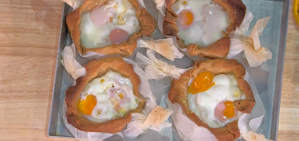 Con dei fogli di carta forno, formiamo come delle caramelle. Mettiamo all’interno il quadrato di sfoglia e, sopra quest’ultima, il brie a dadini, un cucchiaio di burro allo speck e rompiamo sopra due uova intere. Copriamo con un foglio di carta d’alluminio e passiamo in forno caldo fino a doratura della pasta. Serviamo con sopra altro burro allo speck.