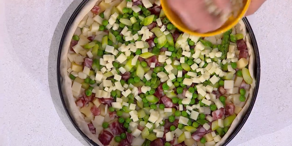 - Ripieno: 100 g provolone dolce, 100 g provolone piccante, 100 g emmenthal, 100 g salame Napoli, 100 g piselli, 100 g asparagi, 5 uova, olio evo, sale e pepe