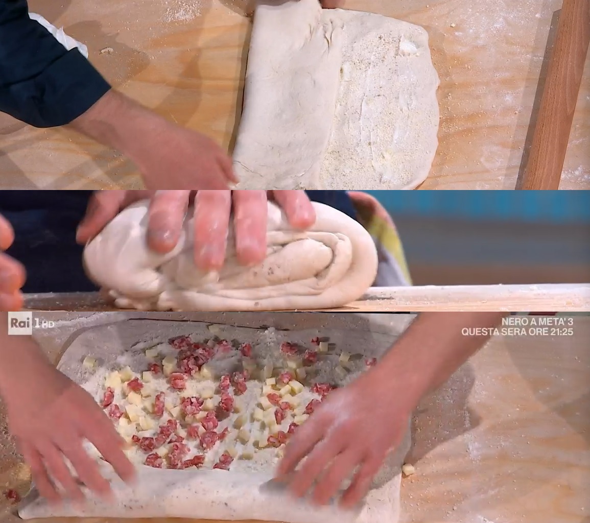 Stendiamo l’impasto lievitato sul piano infarinato, con il mattarello, ad uno spessore di circa mezzo cm. Ottenuto un rettangolo, con le mani, spalmiamo sopra la seconda dose di strutto (non tutto). Spolveriamo con una parte del parmigiano e del pecorino grattugiati ed un po’ di pepe macinato. Ripieghiamo l’impasto a 3, come fosse pasta sfoglia, quindi ripieghiamo nuovamente la striscia ottenuta a 3. Lasciamo riposare per 45 minuti.