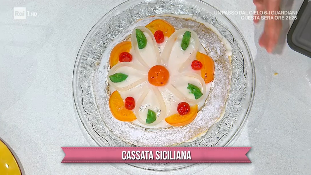 Sciogliamo lo zucchero fondente in un pentolino (lo trovate già pronto in commercio) e lo coliamo sulla cassata: lo spennelliamo uniformemente sulla cassata. Decoriamo con i canditi e dei ghirigori con della ghiaccia reale (1 parte di albume e 5 parti di zucchero a velo).