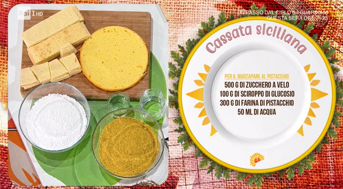 - Marzapane: 500 g zucchero a velo, 100 g sciroppo di glucosio, 300 g farina di pistacchio, 50 ml acqua