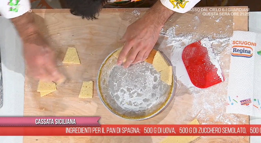 Stendiamo il marzapane al pistacchio su un piano spolverato con abbondante zucchero a velo, utilizzando un mattarello: dobbiamo ottenere una lingua spessa circa mezzo cm. Inseriamo la striscia ottenuta all’interno dello stampo da cassata spolverata con abbondante zucchero a velo, in modo da foderare i bordi. Eliminiamo l’eccesso.