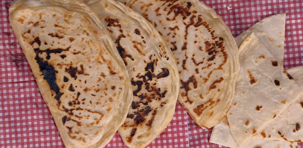 In questo caso, però, disponiamo sopra i dischi ancora crudi la mortadella a fette e, su una metà, spalmiamo dello stracchino, mozzarella a fette (ben asciutta) e del formaggio grattugiato. Ripieghiamo l’impasto sul ripieno, a mezzaluna, sigillando bene i bordi con una forchetta. Appiattiamo il calzone e lo mettiamo a cuocere su un testo o una padella ben calda, sui due lati.
