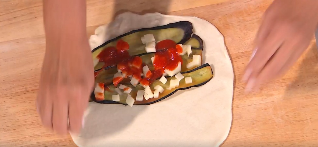 Su ogni disco, su una metà, disponiamo le melanzane fritte, sopra la scamorza a dadini, un po’ di passata di pomodoro condita, parmigiano grattugiato, basilico e ripieghiamo l’impasto sul ripieno, a mezzaluna, sigillando bene i bordi con una forchetta. Li mettiamo a cuocere su una piastra ben calda, sui due lati, appiattendoli delicatamente con una spatola. Possiamo prepararli in anticipo e scaldarli prima di servirli.