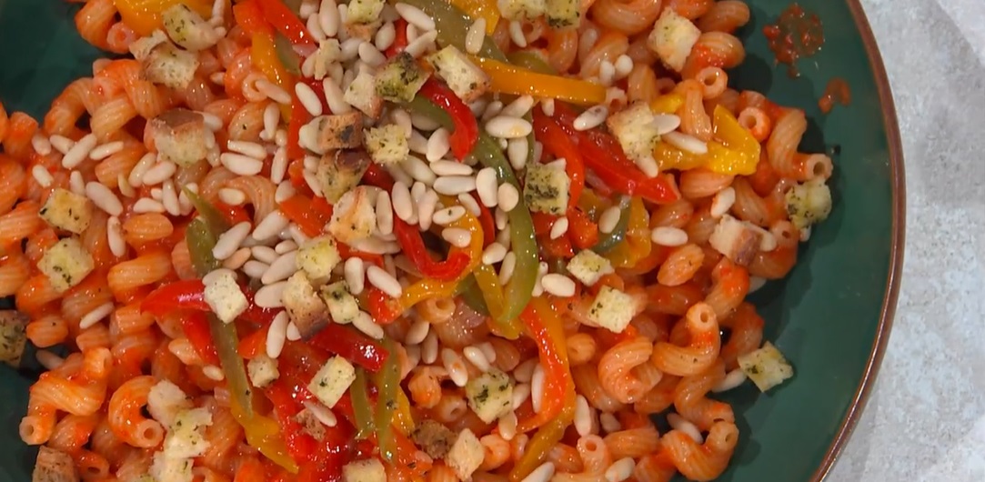 É sempre mezzogiorno | Ricetta cavatappi peperoni pane e pinoli di Carlotta Delicato