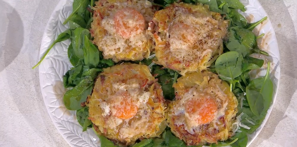 Scaldiamo una padella con una generosa noce di burro. Con il composto di patate, creiamo 4 nidi sulla padella ben calda. Copriamo e lasciamo cuocere per qualche minuto. Una volta dorati, li rigiriamo e lasciamo cuocere ancora qualche minuto.