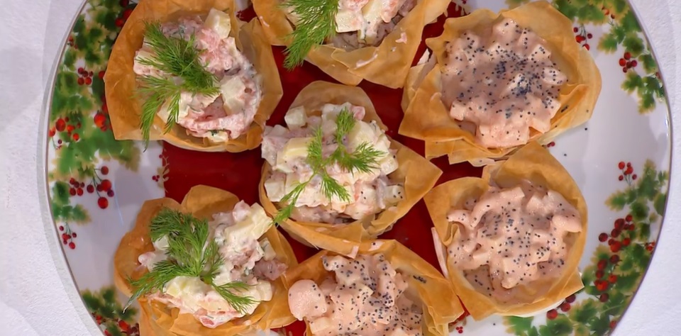 Riempiamo i cestini di fillo con le due farciture. Spolveriamo con semi di papavero quelli con i gamberetti e con l’aneto quelli al salmone. Serviamo subito (non teneteli in frigorifero o si ammorbidiscono).