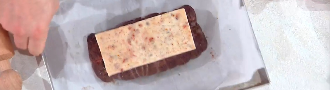 Con largo anticipo, leghiamo il pezzo di carne, come fosse un arrosto, e lo facciamo rosolare in padella con un generoso filo d’olio. Quando è dorato su tutti i lati, aggiungiamo il burro chiarificato, l’aglio e le erbe aromatiche. Dopo pochi minuti, trasferiamo il filetto su una teglia con carta forno e posizioniamo sopra un rettangolo di crosta. Mettiamo in forno caldo, funzione grill, per pochi minuti: deve sciogliersi la crosta.