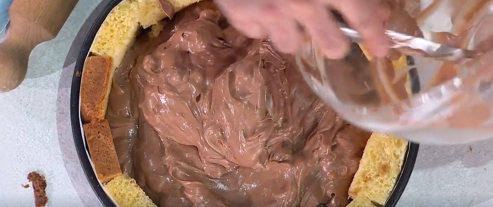 Tagliamo, in orizzontale, la parte più larga del pandoro (la base), in modo da ottenere una stella spessa circa 2 cm. La appiattiamo con un mattarello, rifiliamo i bordi e la inseriamo alla base di una tortiera a cerniera. Foderiamo i bordi della tortiera con dei quadratoni di pandoro.