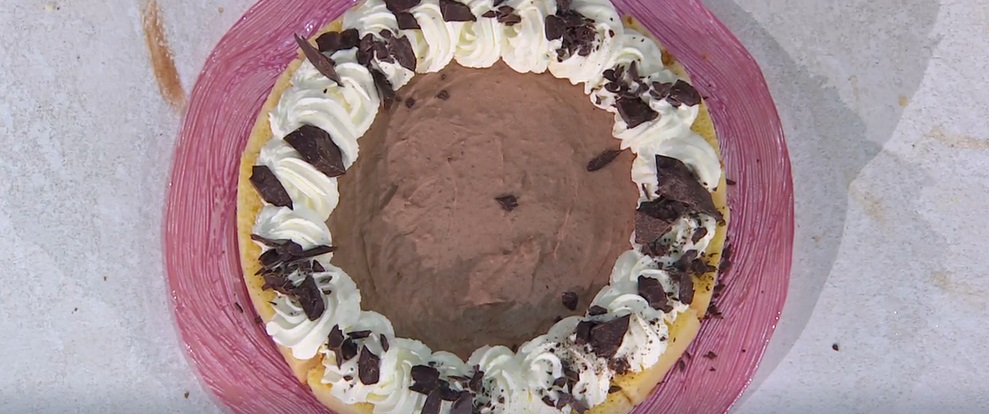 Versiamo tutta la crema all’interno del guscio di pandoro, la livelliamo e la mettiamo in frigorifero per almeno 3 ore. Decoriamo con panna montata e cioccolato tritato.