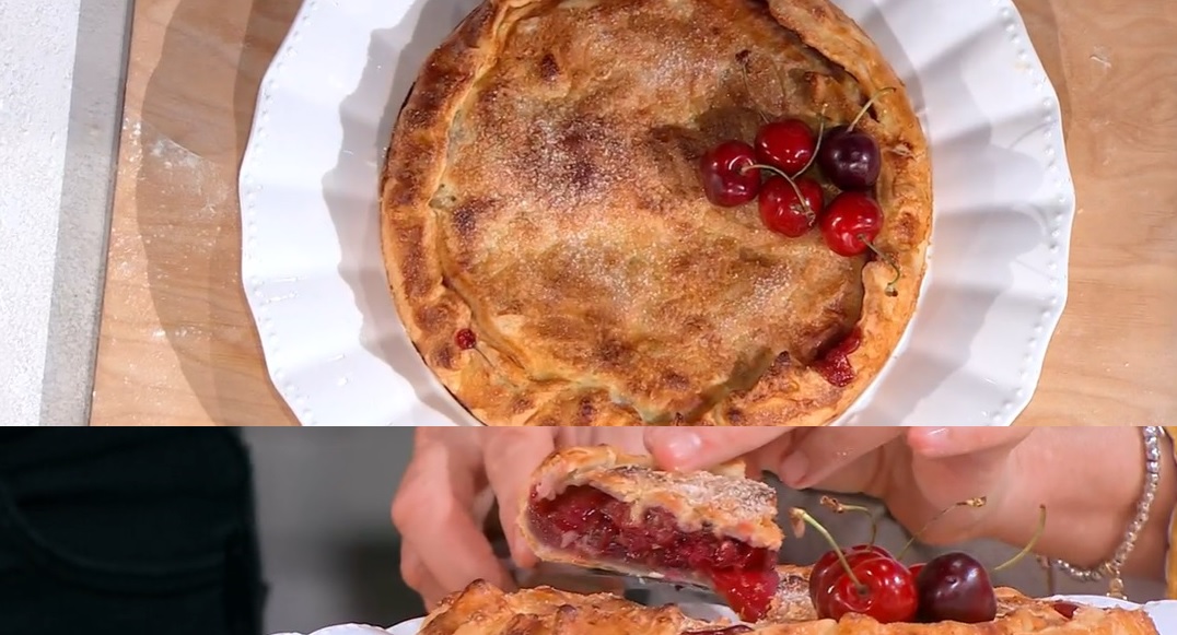 All’interno del guscio di brisè, versiamo il ripieno di ciliegie, quindi copriamo con un disco di brisè e sigilliamo bene i bordi, pizzicandoli. Spennelliamo con il tuorlo e spolveriamo con dello zucchero semolato. Cuociamo in forno caldo e statico, nella parte bassa del forno, a 180° per 40 minuti circa: la base dev’essere ben cotta e dorata.
