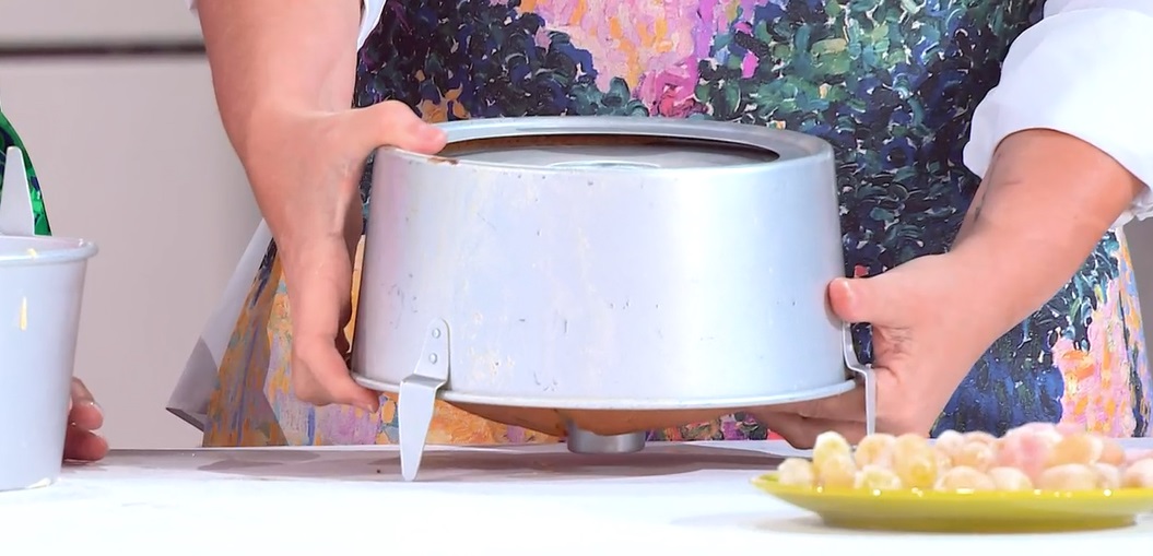 Trasferiamo l’impasto in uno stampo da chiffon cake NON imburrato: deve attaccarsi allo stampo. Cuociamo in forno caldo e statico a 170° per 1 ora circa: dobbiamo fare la prova stecchino, a fine cottura. Appena sfornata, la capovolgiamo su un piano e la lasciamo raffreddare in questo modo. Una volta fredda, la stacchiamo dallo stampo con un coltellino.