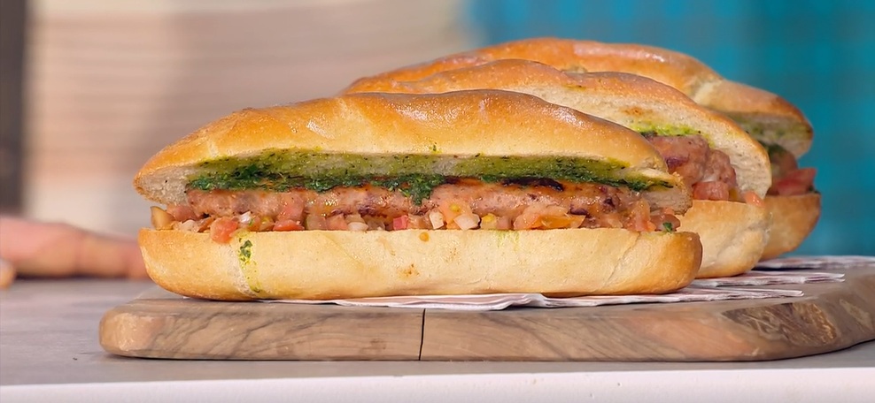 Per farcire, li tagliamo a metà e li farciamo con pomodorini e cipolle crude a dadini, conditi con olio, sale e pepe. Disponiamo sopra le salsicce (chorizo) arrostite e finiamo con la salsa al prezzemolo.