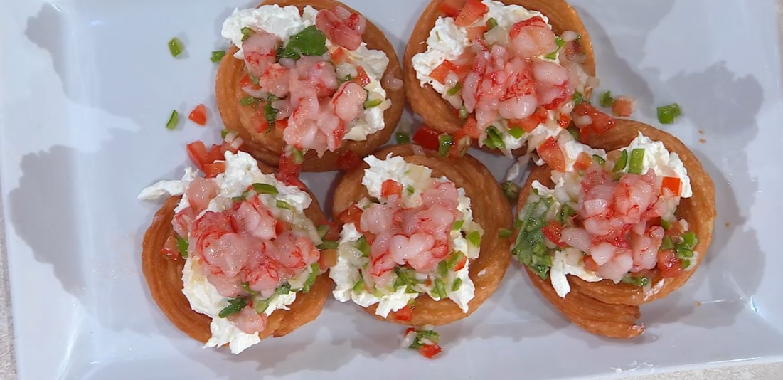 Su ogni churros ormai freddo, mettiamo un po’ di stracciatella, il battuto di verdure e quello di gamberi.