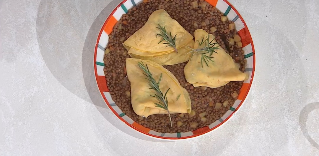Farciamo le crespelle con il ripieno di ricotta e le chiudiamo a fazzoletto. Le serviamo sulla zuppa di lenticchie.