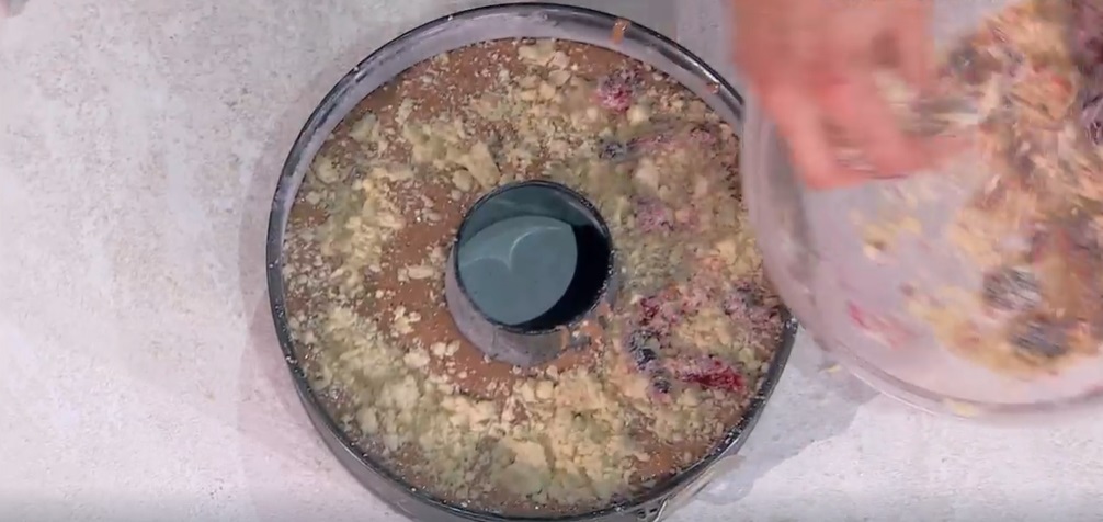 Copriamo la superficie della ciambella con il crumble preparato in precedenza (possiamo anche renderlo rosa unendo dei frutti rossi congelati in questo momento). Inforniamo a 175º, forno già caldo e statico, per 40 minuti (fare la prova stecchino per verificare la cottura).