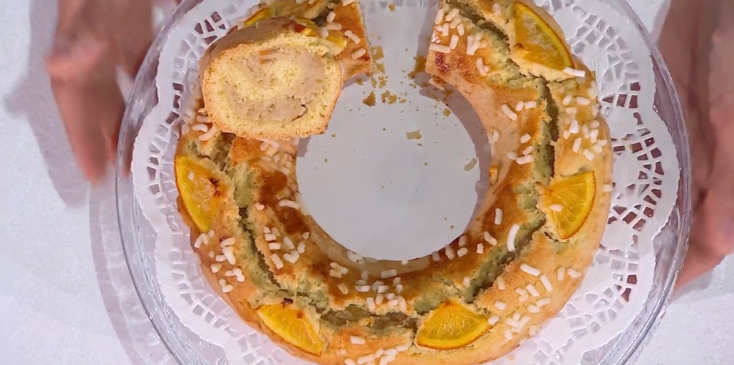 Con il mattarello, stendiamo la frolla ad uno spessore di mezzo cm, dando la forma di un rettangolo. Distribuiamo sopra la farcia, lasciando 1-2 cm dal bordo. Arrotoliamo la frolla sul ripieno, come fosse uno strudel. Congiungiamo le estremità, creando una ciambella, che inseriamo in uno stampo a ciambella ben imburrato. Spennelliamo la superficie con altra marmellata e disponiamo sopra delle fettine sottili di arance e la granella di zucchero. Cuociamo in forno caldo e statico a 170° per 35 minuti.