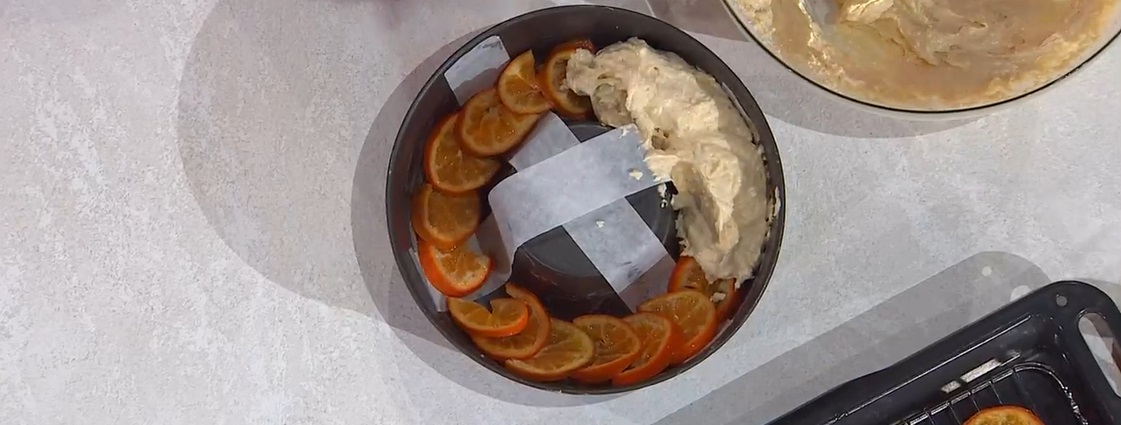 Imburriamo uno stampo a ciambella e disponiamo sul fondo le fettine di mandarino candito, sovrapponendole leggermente. Versiamo sopra l’impasto, livellandolo. Cuociamo in forno caldo e statico a 170° per 45 minuti. Sforniamo e, quando è ancora tiepida, la capovolgiamo sul piatto da portata. La decoriamo con panna montata e la spennelliamo con lo sciroppo ottenuto dalla cottura dei mandarini.
