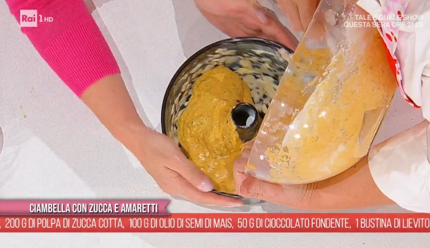 Sgusciamo le uova intere, aggiungiamo lo zucchero e montiamo con le fruste elettriche per qualche minuto. Uniamo alla montata di uova la crema di zucca ed olio. Mescoliamo, quindi profumiamo con la scorza grattugiata d’arancia ed incorporiamo la fecola di patate, la farina ed il lievito per dolci setacciati insieme. Aggiungiamo anche gli amaretti in polvere ed infine il cioccolato tritato. Mescoliamo fino ad ottenere un composto omogeneo.