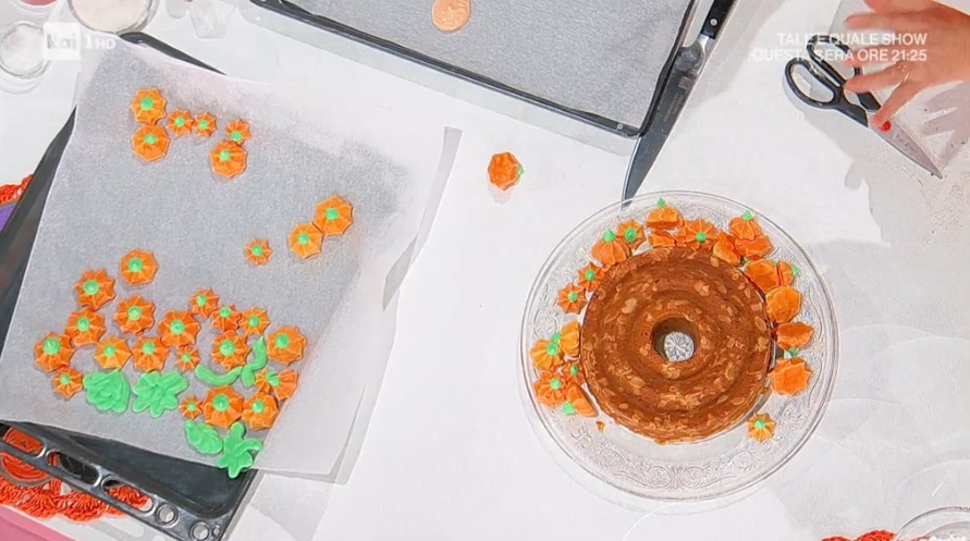 Per le meringhe: montiamo a neve gli albumi con lo zucchero semolato. Quando la meringa è ben montata, aggiungiamo anche lo zucchero a velo, poco per volta, continuando a mescolare. Infine, coloriamo con gocce di colorante arancione e/o verde. Montiamo fino ad ottenere un composto lucido e fermo. Lo mettiamo in una sacca da pasticcere con bocchetta rigata. Formiamo le zucchette su una teglia e, se vogliamo, formiamo dei piccioli verdi con della meringa verde. Facciamo seccare in forno per 2-3 ore a 80-90°.