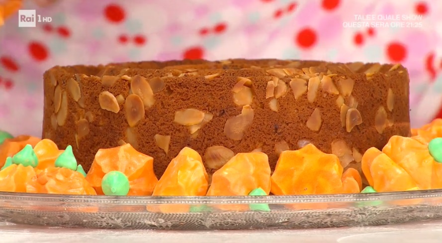 Versiamo l’impasto all’interno di uno stampo a ciambella ben imburrato e cosparso con lamelle di mandorle. Lo livelliamo e facciamo cuocere in forno preriscaldato e statico a 170° per 40 minuti. Lasciamo raffreddare e sformiamo.